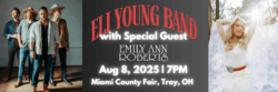 Catch an unforgettable night of music as Eli Young Band takes the stage with special guest Emily Ann Roberts! Join us Friday, August 8, 2025, at 7:00 PM at the Miami County Fair Grandstands. Please note: Fair admission is not included with all ticket prices, and must be purchased separately.