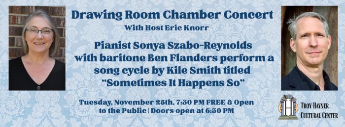 DetailsDrawing Room Chamber Concert – Ben Flanders & Sonya Szabo-Reynolds Tuesday, November 25, 7:30 pm FREE & Open to the Public | Doors open at 6:30 pm The Troy-Hayner Cultural Center is delighted to welcome baritone Ben Flanders and pianist Sonya Szabo-Reynolds to the 2025–2026 Drawing Room Chamber Concert Series. Together, they will perform Sometimes It Happens So, a poignant…