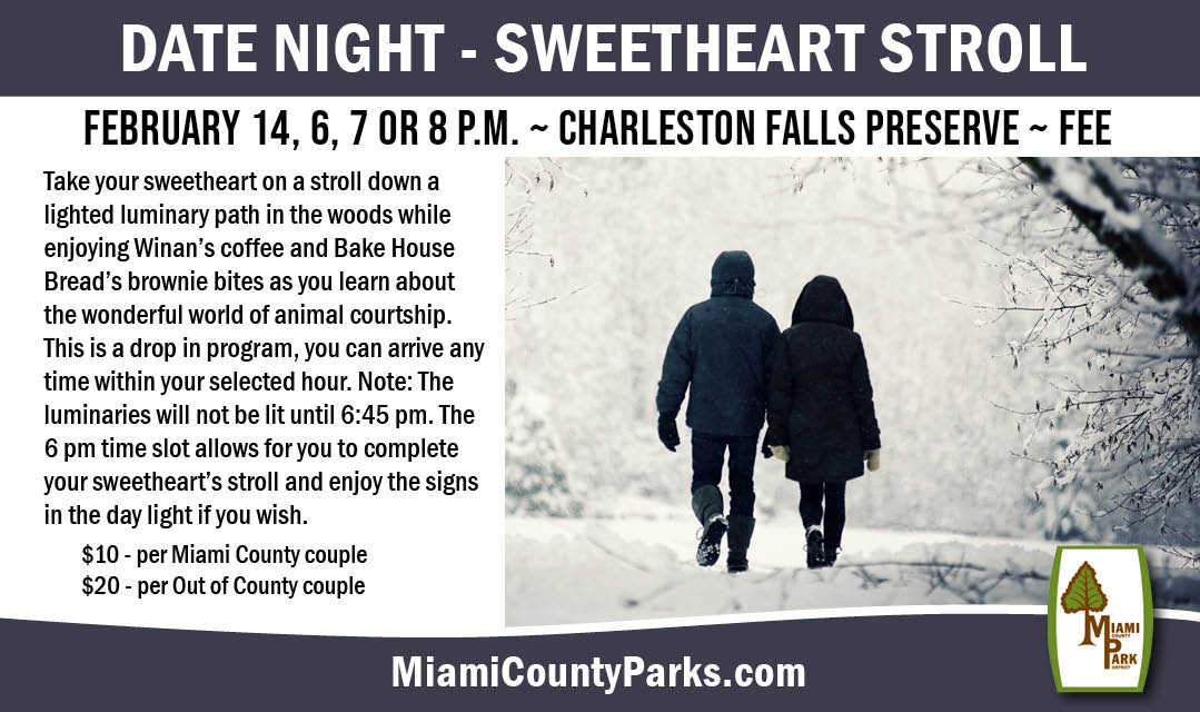 Charleston Falls Preserve 2535 ROSS ROAD, Tipp City, OH, United StatesTake your sweetheart on a stroll down a lighted luminary path in the woods while enjoying Winan's coffee and Bake House Bread's brownie bites as you learn about the wonderful world of animal courtship. This is a drop in program, you can arrive any time within your selected hour. Note: The luminaries will not be lit until ~6:45PM. The 6:00 time slot allows for you to complete your sweetheart's stroll and enjoy the signs in the day light if you wish. $10/couple - 1 Registration per couple.