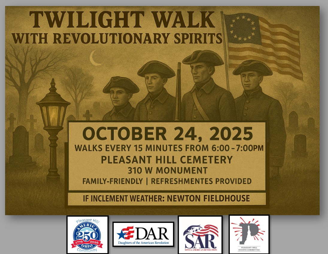 “As twilight falls and shadows lengthen, the Pleasant Hill Cemetery whispers stories of long ago. Walk among the resting places of Revolutionary soldiers and let history stir to life beneath the autumn sky.” ✨ Twilight Cemetery Walk ✨ Join us at the Pleasant Hill Cemetery, 310 W. Monument St., on Friday, October 24th, beginning at 6:00 p.m. Walks will start every 15 minutes until 7:00 p.m. Hear the fascinating stories of four Revolutionary War soldiers laid to rest in our cemetery, brought to life by SAR members in period attire. Refreshments, provided by the local DAR group, will be available