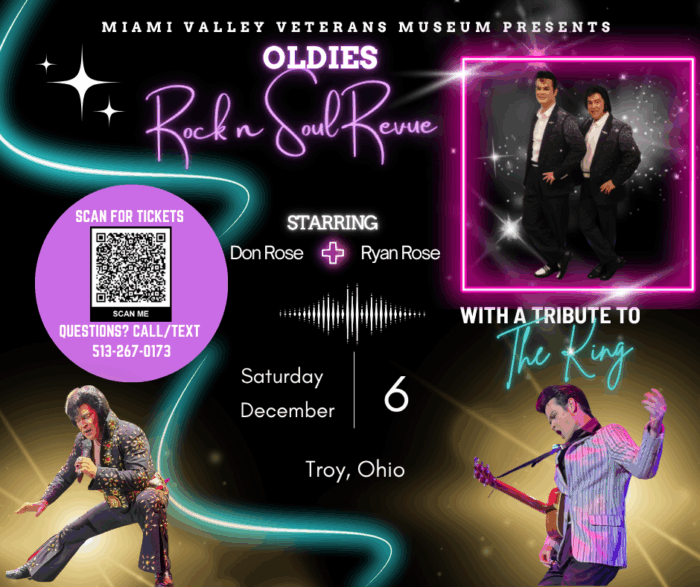 DetailsGather your friends and join us on Saturday, December 6th, 2025, for a Rock N Soul Revue Show starring father & son duo Don & Ryan Rose. This musical event is a fundraiser with proceeds benefiting the Miami Valley Veterans Museum. Event Date: Saturday, December 6th, 2025 @ 5:30 PM – 9:30 PM: Event Location:…