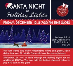 Santa is coming to town and making a stop at the Holiday Lights at Lost Creek Reserve! Bring your children and your camera out to experience a beloved holiday tradition with the jolly old man himself. In addition to a visit with Santa children can enjoy hot cocoa, cookies, a Christmas craft, and games. After visiting with Santa be sure to drive through the Holiday Lights. Don’t delay, there are a limited number of spots with Santa available! You must register each child that will be attending ($10/Child Miami County Resident, $20/Child Out of County Resident).